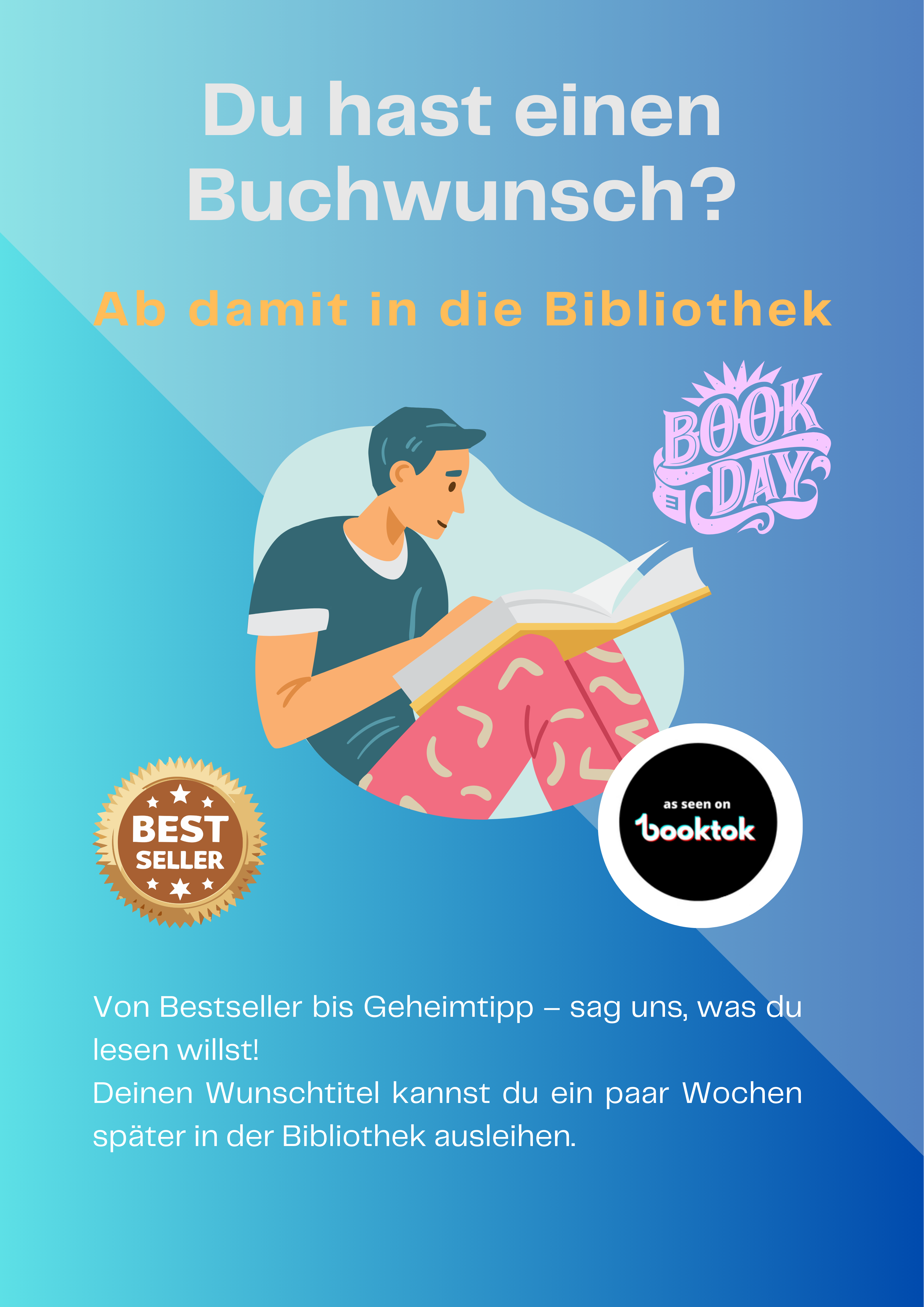 Du hast ein Buch entdeckt, das dich besonders interessiert – egal ob aktueller Bestseller, spannender Jugendroman, Sachbuch, Manga oder ein Geheimtipp, von dem du denkst, dass ihn noch viele andere lesen sollten? Dann teile uns deinen Wunsch mit!